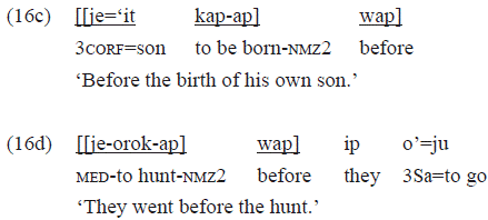 The examples 16c and 16d, below, have a nominalized verb as head of the complement of the pp headed by «wap», that takes on a temporal value there: