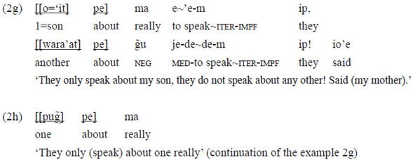 In the example 2g, the verb «'e» 'to speak' occurs, reduplicated and with the suffix of imperfective aspect «-m»5: «e~'e-m». In this case, the subject is not morphologically explicit, typical of this aspect, but it can easily be restored in the discursive context, having been cited in the previous statements. This verb is intransitive and does not require a direct object in the form of a phrase or pronominal index in the verb. The topic of the gossip is expressed in a PP: «[[o='it] pe]» 'about my son'. The same occurs with the verb «je-de~de-m» 'to speak meanly of somebody/engine noise', equally reduplicated, with imperfective and intransitive suffix. The target of this 'to speak' is also a PP: «[[wara'at] pe]» 'about another' and «[[pug̃] pe]» 'about one' (example 2h). This last example includes a numeral pronoun as complement of the postposition. Finally, these addressees or targets of gossip appear in postpositional phrases. This is not required syntactically by the verb, but it is semantically important and indispensable for the construction of the narrative.