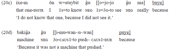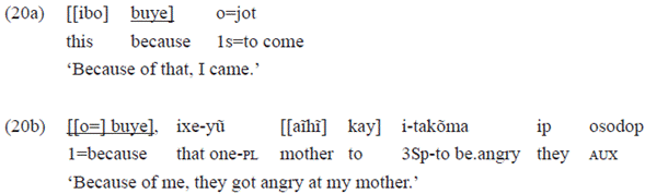 In the example 20c, the postposition «buye» takes a very evident subordinator value, since its complement is a clause that still preserves its verbal features (clitic markers of subject and direct object, respectively «o=» '1st person subject' and «jo-» '3rd person object'.