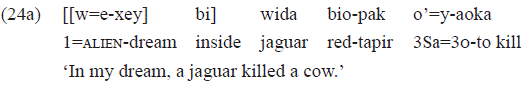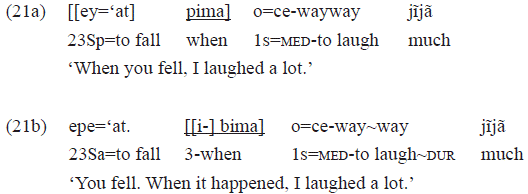 Comparing these examples, we can notice that an absolutive pronoun in 21a is used («ey=») and a nominative pronoun in 21b («epe=») to express the same person of the discourse with the same verb («'at» 'cair'). The latter pronoun is the actual form with the processual verb in question, while the former is also the pronoun of (1) nominal possession, (2) direct object, and (3) subject of stative verb. Then, it is possible to assume that the example 21a presents a certain degree of nominalization, caused by the subordination of the clause to the postposition «pima». The absence of this subordination, as seen in the example 21b, does not cause any degree of nominalization to the clause. In the example 21b, «pima» functions more like a postposition, being inflected for the 3rd person with which retakes anaphorically what was said. It is important to highlight that the personal prefix usually refers to an absolutive argument.