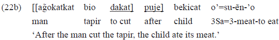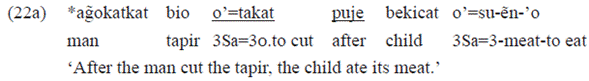 This would explain the non-grammaticality of clauses such as that of the example 22a below, where we find the use of a person marker in a clause conducted by the postposition «puje» («o'takat»), when compared to the grammaticality of clauses such as the example 22b, where the personal marker in the verb does not occur («dakat»):