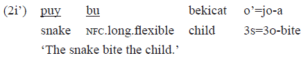 In the example 2i', the subject is «puy bu» 'snake' and the object is «bekicat» 'child'. These grammatical relations are confirmed by the constituent order and the cross-reference markers in the verb. If the subject were a second person, «puy bu» 'snake' would be replaced by «ẽn» 'You', and «o'=» 3Sa would be replaced by «e=» 2s. In the example 2i', «puy bu» 'snake' is the agent and «bekicat» 'child' is the patient. In Munduruku, it is possible to introduce a new agent: an indirect agent (the causer). A transitive verb like «a» 'bite' will be followed by the suffix «-at», which is responsible for turning transitive verbs into causative verbs. The direct agent (the causee) is moved to the end of the sentence and it becomes part of a postpositional phrase (Gomes, 2014). The example 2i' ' shows a pp with a semantic role of direct agent where the head is «be»:
