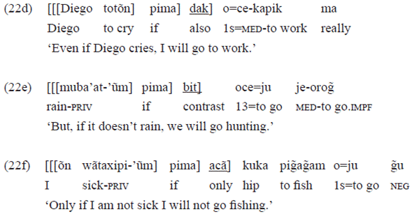 The notions of 'inclusion' «dak» (example 22d), 'contrast' «bit» (example 22e) and 'restriction' «acã» (example 22f) are some of the several functions associated to particles in Munduruku, a category we described in Gomes (2006, section 4.4).