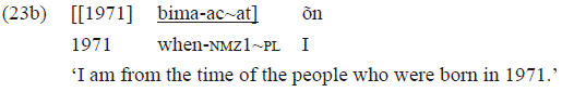In the example 23b, the postposition «bima» receives the nominalizing suffix «-at», that is reduplicated to indicate plurality: «-ac~at». In this type of use context, the formed Np functions as equative nominal predicate with the purpose of expressing a characteristic of the subject. It is interesting to highlight that to be used as head of locative and possessive predications, the postpositions do not need to be nominalized.