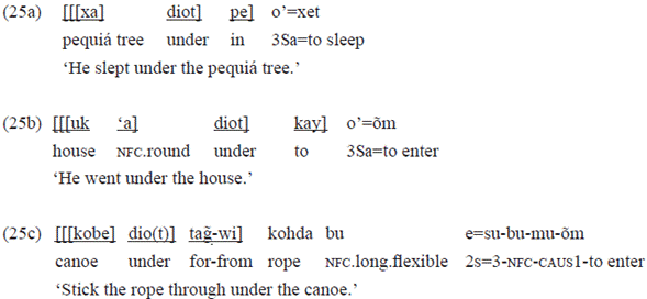 Some inalienable nouns can form a postpositive locution with postpositions. An example of that is the noun «diot» 'under' that appears below, forming a locution with the postpositions «pe» 'in' «kay» 'for' and «tag̃-wi» 'for-from':