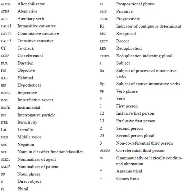 For a more detailed understanding of this category, we present and exemplify each of the postpositions of this table in the most varied contexts that we have had access to in our field work between 1999 and 2017. This will allow for better exploration of the forms and functions of these postpositions, especially their role in linguistic processes of modality, causativity, passive voice, and subordination, besides the roles typically associated with the PP.