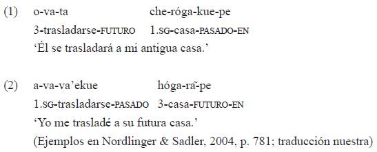 Con respecto a esta lengua, la crítica de Tonnhauser (2008) a Nordlinger y Sadler (2004) aporta una serie de precisiones sobre la semántica de las marcas de 'futuro' y 'pasado' en guaraní y establece que no se comportan como marcadores típicos de tiempo (tense) sino más bien como un sistema aspectual. Muysken (2008) considera acertadas las precisiones de esta segunda autora, pero señala como falencia que ella no propone una tipología alternativa para clasificar el fenómeno y que deja de lado lo que ocurre con los marcadores de alcance proposicional que sí tratan las autoras citadas. Es posible que los mismos marcadores codifiquen las categorías TAM en nombres y verbos, como ocurre, según estas mismas autoras, en varias lenguas de Norteamérica. Otras categorías TAM diferentes a la de tiempo (evidencialidad, modo)7 pueden marcarse en los nominales.