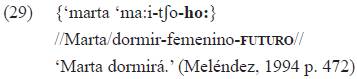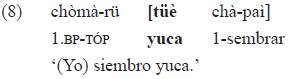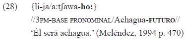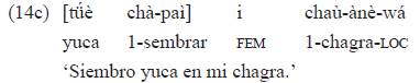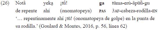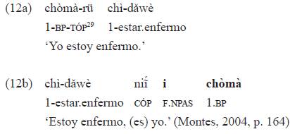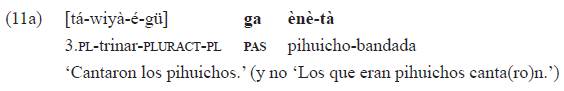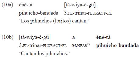 Esa marca de género-tiempo introduce la especificación léxica (opcional) de argumentos (sintagmas nominales en función de sujeto y objeto) cuando estos se desplazan de su posición usual, como en el ejemplo 10b lo hace el sintagma nominal sujeto, correferente27 con el índice «tá-»: