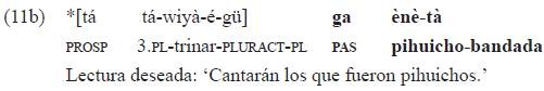 En caso de que la marca de género-tiempo sea la de pasado, no cabe la interpretación del tiempo intrínseco del referente del nominal ('la que fue yuca', 'los que fueron pihuichos'), sino que se interpreta el predicado globalmente como algo que ocurrió en el pasado, lo que se ilustra en el ejemplo 11a).
