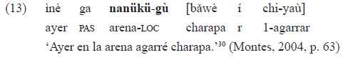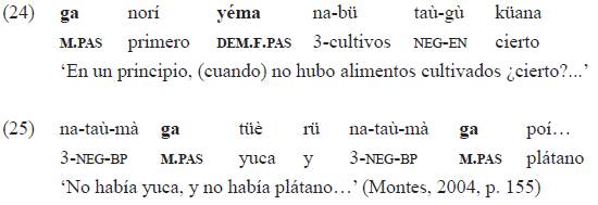 Cuando inicia el relato sobre el origen de los alimentos, en el ejemplo 24, la partícula de pasado se ubica antes de «norí» ('en un principio'), en el mismo lugar en que pueden aparecer otros marcadores modales (frustrativo, eventual, hipotético), operadores del nivel de la cláusula. Luego, cuando el relato continúa, en el ejemplo 25, la marca de género pasado tiene un ámbito más local, ligada a la expresión de nominales que son argumentos del predicado 'carecer'42: