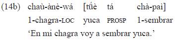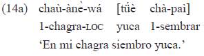 En el no-pasado, el sintagma nominal con caso locativo 'en mi chagra' no exhibe marca de género-tiempo si está en posición preverbal, orden no marcado30: