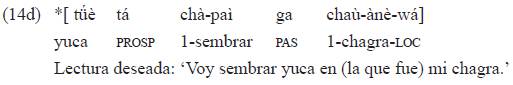 En definitiva, la coocurrencia de las marcas de pasado y prospectivo no se atestigua. Un corolario de lo hasta aquí expuesto es que, en cláusulas simples, la expresión de la categoría de pasado requiere que los sintagmas nominales tengan una posición que permita la aparición del conjunto de marcas de género-tiempo. Así ocurre con el sintagma nominal en función de objeto cuyo lugar canónico (en el no-pasado) es preverbal, pero también con el sintagma nominal sujeto, el cual debe desplazarse para expresar tiempo. Los sintagmas nominales posposicionales y adverbiales, igualmente, pueden o no expresar el género-tiempo dependiendo de su ubicación con respecto al núcleo verbal. Consideramos que las estructuras oracionales que siguen el orden canónico son no marcadas para género-tiempo.