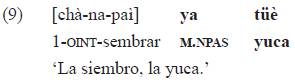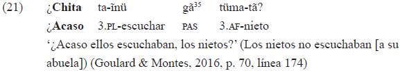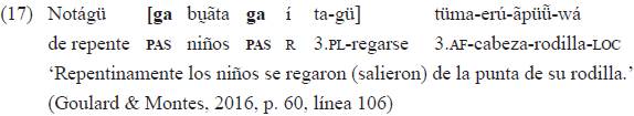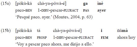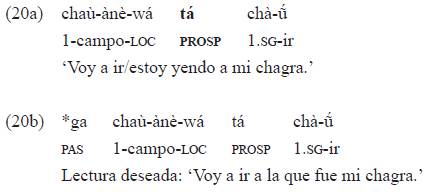 El ejemplo 16 muestra, además, compatibilidad entre el pasado nominal y categorías aspectuales del verbo como el imperfecto expresado con un morfema que tiene primariamente un valor direccional, el morfema {-a} que se ubica entre el índice sujeto y el verbo.