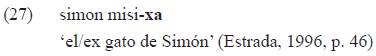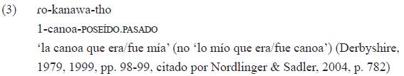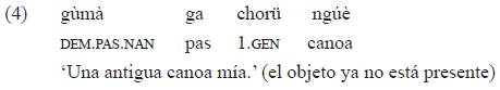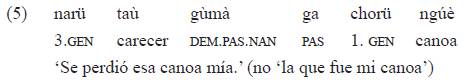 No parece que este tipo de ambigüedad ocurra en tikuna, pues un sintagma nominal análogo tendría necesariamente una lectura a nivel de la cláusula y no habría posibilidad (como en guaraní, ejemplos 1 y 2) de una disyunción entre el tiempo del nominal y el del verbo. En tikuna, un sintagma nominal similar no se referiría a la caducidad de la relación posesiva, sino más bien al carácter no presente del elemento designado por el nominal: