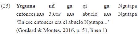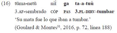 Lowe (1960, p. 10) anotó que el paradigma de enclíticos puede considerarse un indicador de subordinación. La partícula de género-tiempo (pasado en el ejemplo 16) puede introducir efectivamente oraciones de tipo subordinado (en este caso, sin indicación de subordinación diferente al género). La oración es también una hendida como la del ejemplo 12b. Adicionalmente, «ga» actúa aquí como nominalizador, pues permite introducir la oración «ta-a-tuú» en el lugar usual de los predicados nominales31: