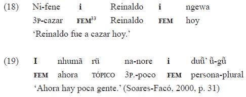 Soares-Facó (2000, pp. 25-35) trata ampliamente hechos relativos a la aparición de las «partículas» de femenino, masculino y pasado cuando aborda el orden SVO, en el cual el argumento paciente se halla desplazado a la derecha del verbo32. Señala que estas partículas no aparecen solo antes del argumento p (por eso están también antes de los nominales 'Reinaldo' y 'gente' en los ejemplos 18 y 19), sino que pueden preceder más de un ítem en la misma oración. Para ello, proporciona ejemplos en los que además del argumento P, hay elementos adverbiales ('hoy', 'ahora')33 comparables a nuestros ejemplos en 17: