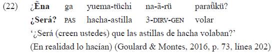 Algo similar ocurre en el ejemplo 22, donde también se formula una pregunta retórica e irónica con «e ná» ('¿será?'), una partícula que señala posibilidad-duda en combinación con el aspecto imperfectivo marcado en el verbo36 a través del direccional verbal37.