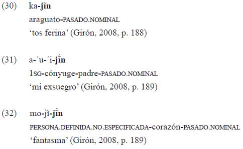 El citado autor ilustra la marca de pasado nominal para el nombre de una enfermedad (ejemplo 30), un parentesco que ya no es válido (ejemplo 31) y un fantasma o espíritu que queda de alguien (ejemplo 32); además, esta marca se usa para una camisa que ya no sirve porque se rasgó, una cosa que no funciona, una casa abandonada, entre otros ejemplos que trae este autor: