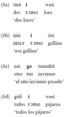 Género, animacidad y tiempo operan, así, una clasificación exhaustiva e ineludible de los nominales. Estas categorías se expresan en el marco de la relación de determinación al interior de los nominales. La marca de género-tiempo está, así, en las construcciones con determinantes numerales, como en el ejemplo 6a, con deícticos de visibilidad-distancia y otros determinantes, como en los ejemplos 6b y 6c y con otros cuantificadores, como en el ejemplo 6d.