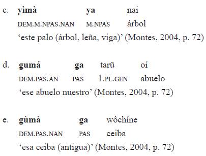 El paradigma de demostrativos no anafóricos, ejemplo 6b, no tiene forma para pasado, solo expresa dos valores de distancia y de género («dá, ñáá», 'cercano' masculino y femenino, respectivamente; «gúá, yéá», 'lejano' masculino y femenino, respectivamente). Los demostrativos-anafóricos15 de la Tabla 3 concuerdan en género, número y animacidad con el nombre núcleo, como aparece en el ejemplo 7. Además, exigen la presencia del clítico.16