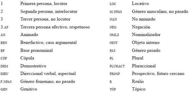 Se señala que la oposición entre vigencia y caducidad se cumple a través del uso combinado de los clíticos de género, los anafóricos y los conectores (Montes, 2004, p. 157). Las marcas de 'pasado' no están restringidas a las narraciones míticas, aunque sean más frecuentes en ellas; en estas puede aparecer también un evento del pasado introducido con las formas de vigencia, así como en la vida cotidiana es posible usar las formas 'caducas' para hablar de un evento del pasado reciente, como lo muestran los ejemplos 13 y 16. Típicos inicios de relatos míticos involucran tanto un conector flexionado para pasado, como clíticos de pasado sobre elementos nominales:
