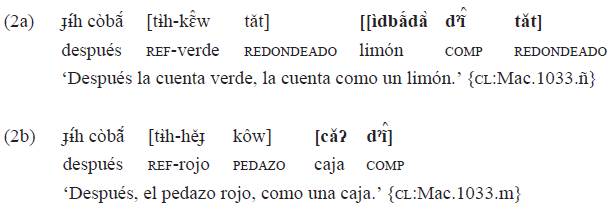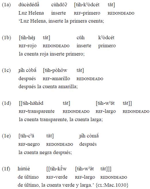 En el ejemplo 1, se presenta el párrafo proferido por un hablante masculino, dirigiendo a una mujer para construir la configuración de cuentas presentadas en la Figura 6a. Como se puede ver, la palabra dependiente en la primera posición describe la entidad en términos de su lugar inicial en la configuración (1a), su color (1b, c, e), y su color y longitud (1d, f)13. La segunda posición presenta el núcleo, un clasificador que refiere a la forma redondeada del referente inanimado descrito. En los ejemplos 1d y 1f se observan dos tipos de construcciones para referir a más de una característica: en 1d, la coordinación por yuxtaposición de dos frases nominales, cada una con su clasificador como núcleo; y en 1f, la coordinación por yuxtaposición de dos palabras cualificativas, con un solo clasificador como núcleo. En ambos casos, un constituyente describe la longitud; y el otro, el color, mientras que el clasificador describe la forma.