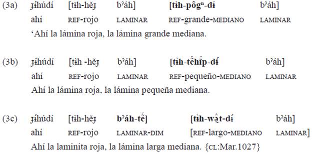 Usando estímulos como el que se presenta en la Figura 6b, se recabaron los ejemplos 3, donde se observa el uso de morfemas derivacionales en la formación de la palabra dependiente y del clasificador. Como se observa, el dependiente que denota un tamaño mediano está formado por el prefijo referenciador, las raíces 'grande' (3a), 'pequeño' (3b) y 'largo' (3c) y el sufijo «-di» (MEDIANO). Igualmente, se puede ver que los clasificadores pueden sufijar el diminutivo para denotar una forma pequeña (3c).
