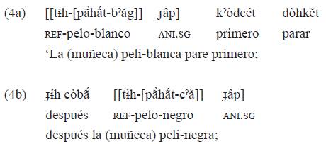 En el ejemplo 4 se presenta el párrafo proferido por un hablante masculino, dirigiendo a una mujer para construir la configuración de muñecas presentada en la Figura 6c. Como se puede ver, la construcción cualificativa presenta la misma estructura antes vista, con algunas variaciones: la primera posición contiene una palabra compuesta por el dependiente ('pelo') y el núcleo ('blanco'), que describe la característica 'peli-blanca' de la muñeca; y la segunda posición presenta el morfema clasificador para entidades animadas singulares.