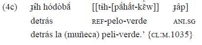 Resumiendo, a partir de los ejemplos, es posible observar que las frases nominales cualificativas están formadas por dos constituyentes cuyo orden es dependiente-núcleo. El núcleo, en posición final, es representado por un clasificador que refiere a las entidades inanimadas en términos de su forma (v. g. redondeado, laminar) y a las animadas en términos de su animacidad (y número singular o plural). Es decir que, si el referente está presente en el contexto situacional, se puede hacer referencia a él y seguir su pista, usando un clasificador y no un nombre que lo designe de manera unívoca. El dependiente, en posición inicial, puede estar formado por: (1) una cláusula que describe propiedades de comportamiento de las entidades referidas (v. g. ser objeto de temor o vivir en determinado lugar, como en los ejemplos 5); (2) una palabra constituida por un prefijo referenciador y una base (que puede ser una raíz o un compuesto) o una secuencia de palabras con la misma estructura que la recién descrita; estas palabras describen propiedades de las entidades tales como la dimensión (tamaño, longitud), el color u otras características (v. g. peli-banco).