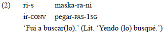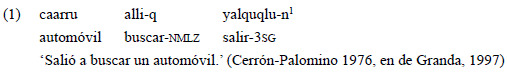 Sin embargo, en algunas lenguas como en el quichua santiagueño, cuando esta construcción involucra al verbo «ri-» ('ir'), es reanalizada como un futuro perifrástico y ya no expresa desplazamiento espacial (de Granda, 1997), al menos en ciertos contextos. La hipótesis central de este trabajo consiste en que la lengua ha desarrollado otra estrategia para señalar MCP, ilustrada en el ejemplo 2: una cadena clausal (clause-chain)2 con un converbo de movimiento (señalado mediante el sufijo «-s») seguido de un evento de propósito que se realiza como un verbo finito. La relación que establecen el converbo y el verbo finito permite codificar, tal como es esperable para una relación de MCP, una secuencialidad de acciones y la intención de un único participante sobre ambas (Van Valin, 2005).