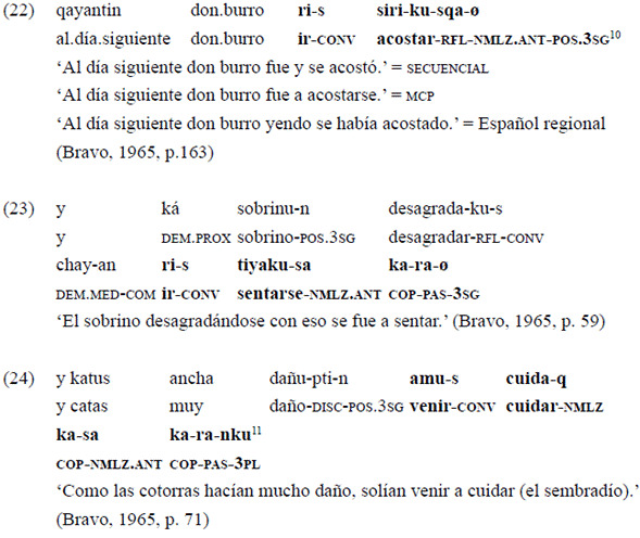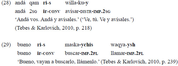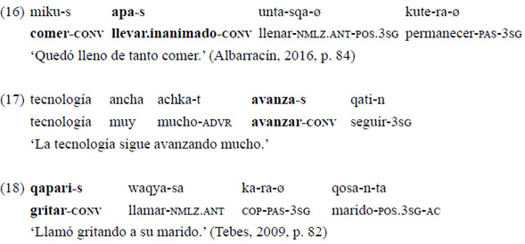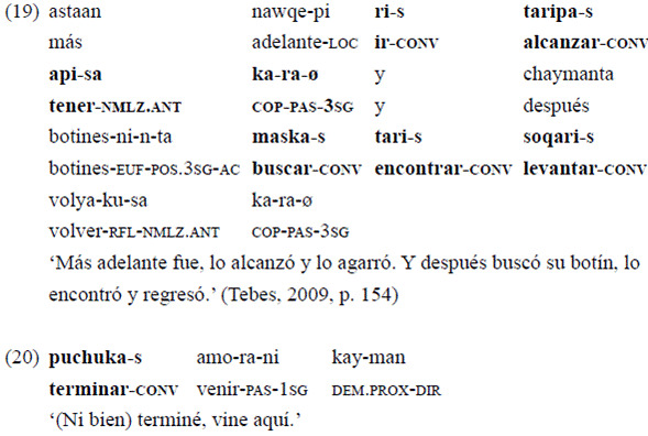 Siguiendo la propuesta desarrollada en Juanatey (2016, 2017) para el quichua santiagueño, se identifica como converbos a las formas deverbales señaladas mediante el sufijo «-s» que participan de (1) la modificación adverbial y (2) la formación de cadenas clausales.