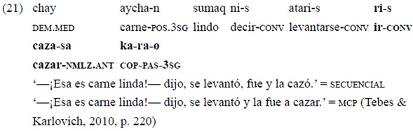 En el ejemplo 21, el verbo de movimiento «ri-» ('ir') forma parte de una cadena de tres eventos secuenciales llevados adelante por el mismo sujeto: «ni-» ('decir'), «atari-» ('levantarse'), «ri-» ('ir') y «caza-» ('cazar'). Los verbos mediales toman la forma de un converbo, mientras que el evento final es un verbo finito. Es posible, entonces, interpretar la relación entre las últimas dos acciones, ya sea como una secuencia 'fue y cazó' o como MCP, 'fue a cazar'.
