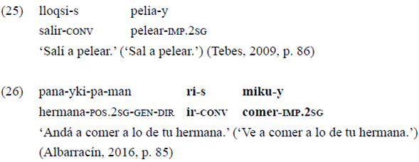 La interpretación de MCP se vuelve más clara cuando el propósito se codifica en verbos en modo imperativo. Estos casos ya fueron descritos por Albarracín (2016) y Nardi (2002), entre otros; aunque solo los consignan con el verbo 'ir'. Como se ve en los ejemplos 25 y 26, las formas converbales de los verbos de movimiento seguidas de un verbo en imperativo indican una orden que implica un movimiento previo.