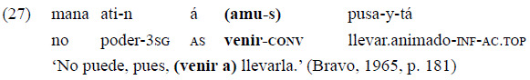 Por ejemplo, se ha notado que en estas relaciones de MCP el converbo de movimiento se realiza inmediatamente anterior al verbo de propósito, estableciendo un orden secuencial en virtud de establecer la relación de propósito. Así como puede verse en el ejemplo 27, si se quiere agregar un desplazamiento previo que habilita la realización de la acción «pusa-» ('llevar.animados'), es posible intercalar un converbo de movimiento entre el verbo modal y el propósito.
