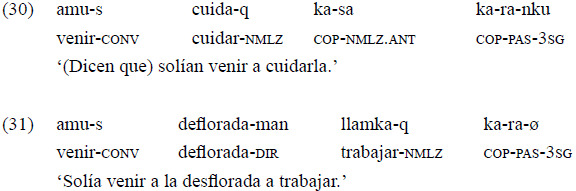 Del ejemplo 30 en particular, es interesante notar que el converbo se integra a una perífrasis que señala a la vez referencia temporal de pasado, aspecto habitual y evidencialidad (evento alejado del conocimiento del hablante).