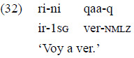 Como se describió en el apartado sobre la gramaticalización de la construcción de MCP, la lengua cuenta con una construcción de MCP que consiste en un verbo finito de movimiento y una cláusula de propósito nominalizada con el sufijo «-q». Se reitera un caso en el ejemplo 32. Esta construcción, cuando involucra el verbo de movimiento 'ir', ha sido afectada por un proceso de gramaticalización, por lo que es más frecuente que sea interpretada como una perífrasis de futuro.
