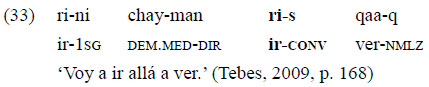La perífrasis de futuro es la misma en los ejemplos 32 y 33: «rini qaaq» ('voy a ver'). A esta perífrasis, se suma, en el ejemplo 33, el converbo de movimiento «ris» para indicar el desplazamiento espacial. En otras palabras, se trata de un ejemplo de una relación de MCP con un converbo de movimiento («ris») y el futuro perifrástico («rini qaaq»). El ejemplo anterior ilustra, por un lado, la existencia de una construcción gramaticalizada que señala futuro perifrástico donde el verbo 'ir' se ha desemantizado y, a la vez, la hipótesis central de este trabajo: la introducción de una forma converbal de movimiento habilita una lectura de MCP en relación con la acción principal.