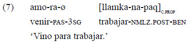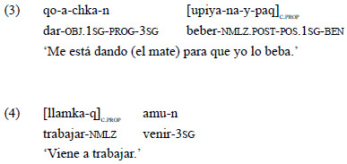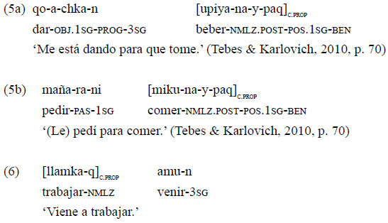 La construcción de MCP, por su parte, involucra un sufijo nominalizador «-q» que no establece ninguna relación temporal con el tiempo del verbo principal y no puede llevar marca independiente de persona actora (sí de persona objeto), como puede verse en el ejemplo 6 «llamkaq» ('a trabajar'). En estos casos, el orden de la cláusula finita y la nominalizada pueden variar (Albarracín, 2009, p. 191), mientras que las cláusulas de propósito general, como las de los ejemplos 5 y 7, suelen ser pospuestas a la cláusula principal.