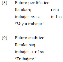 En el quichua santiagueño, la construcción con una nominalización con el sufijo «-q» y el verbo de movimiento «ri-» ('ir') se ha desarrollado como un paradigma perifrástico de futuro que coexiste con otro de futuro analítico, cuya distribución no es exactamente la misma (Albarracín, 2011, p. 35). En los ejemplos siguientes, se ejemplifican ambas formas.