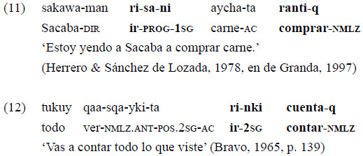 La primera construcción, «pallaq risunchis», del ejemplo 14 (modificada del ejemplo 11), se interpreta como 'iremos a juntar (con desplazamiento)'. De esta manera, expresa una relación de MCP que tiene referencia hacia el futuro gracias al sufijo de tiempo «-su» del verbo finito. La cláusula de propósito nominalizada es deranked y el verbo de movimiento independiente. Se trata, entonces, de una relación entre dos eventos diferentes. Por otra parte, en el ejemplo 15 «pallaq riychis», el verbo finito no lleva marcación alguna de tiempo (el presente es no marcado en la lengua). Sin embargo, toda la construcción se interpreta como un único evento en el futuro: 'vamos a juntar (sin desplazamiento)'. Ejemplos como el 15 constituyen una perífrasis de futuro donde el verbo de movimiento es siempre «ri-» ('ir'), que se ha desemantizado (ya no implica un desplazamiento espacial) y funciona como el verbo auxiliar. A esta segunda construcción, muy frecuente en el quichua santiagueño, es a la que hace referencia de Granda (1997) con el ejemplo 12.
