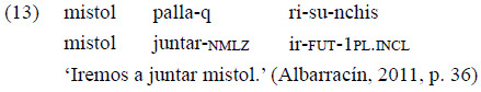 Albarracín (2011, p. 36), por su parte, argumenta que en el quichua santiagueño «sobreabundan ejemplos en donde el verbo auxiliar «riy» no solo conserva el rasgo semántico 'desplazamiento espacial' sino que incluso él mismo puede estar en futuro [...]». Esto se ilustra en el ejemplo 13, donde el verbo «risunchis» ('iremos') es el que expresa desplazamiento espacial. Lo que aporta la autora con esta argumentación es que en quichua santiagueño sigue existiendo posibilidad de señalar MCP mediante el verbo «ri-» ('ir') y una nominalización con «-q».