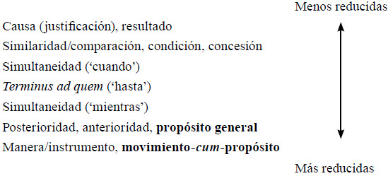 Por último, las relaciones de propósito se caracterizan por un alto grado de integración semántica y sintáctica entre los eventos principal y dependiente, por lo que el uso de formas menos independientes en cláusulas de propósito (con categorías reducidas de tiempo, modo o aspecto o persona no expresadas en el verbo) refleja una motivación icónica entre el grado de integración semántica de los eventos y la integración sintáctica de las cláusulas. A estas características, subyace la noción de iconicidad de independencia (iconicity of independence) que señala que cuanto menos independientes sean dos conceptos, menos independientes serán las expresiones que las codifiquen (Cristofaro, 2005) -o en la propuesta de Givón (2001), cuanto más fuerte sea el lazo semántico entre los eventos relacionados, más fuerte será la integración sintáctica de las dos cláusulas-. Por lo tanto, las estrategias que expresan relaciones de MCP tienden a codificarse en las lenguas del mundo con las formas menos independientes disponibles para el señalamiento de relaciones adverbiales (Figura 2) (Hetterle, 2015).