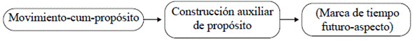 De esta manera, las cláusulas de MCP son generalmente más económicas en comparación con las construcciones de propósito generales, por contener menos complejidad estructural o material lingüístico: suelen poseer argumentos implícitos, formas verbales no finitas, omisión de conjunciones, fuerte integración a la cláusula matriz, entre otras (Schmidtke-Bode, 2009, pp. 96-97). Incluso, en muchas lenguas, con el tiempo, la alta integración semántica y sintáctica entre los eventos relacionados puede continuarse en un proceso de gramaticalización que lleva a la construcción de MCP a un complejo mono-clausal del tipo auxiliar-verbo, adquiriendo nuevas funciones gramaticales, generalmente ligadas a marcadores de tiempo y aspecto. En este sentido, está bien documentada la gramaticalización de construcciones de MCP en perífrasis de futuro o, incluso, de verbos de movimiento como 'ir' en marcadores de tiempo (Heine & Kuteva, 2002; Schmidtke-Bode, 2009). Este proceso de gramaticalización, representado en la Figura 3, será ejemplificado con el quichua santiagueño en la siguiente sección.