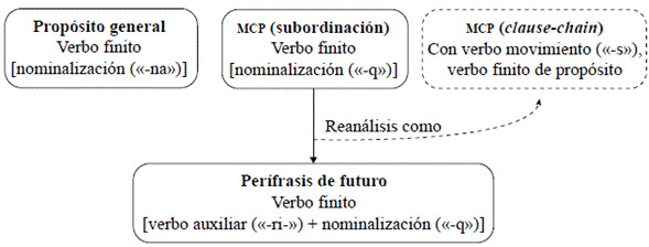 En síntesis, el quichua santiagueño cuenta con una construcción para expresar MCP con un verbo de movimiento y una nominalización con «-q»; y, a la vez, ha desarrollado una perífrasis de futuro con el verbo 'ir' como auxiliar. En estos últimos casos durante el proceso de gramaticalización, la construcción fue afectada por diferentes subprocesos: