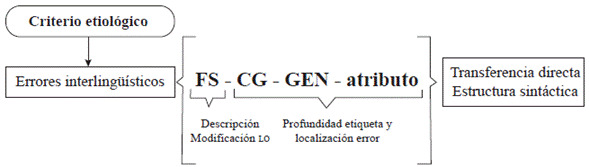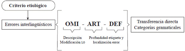 La aplicación de una taxonomía para la identificación de errores etiológicos permite indagar el estado de la interlengua. El criterio etiológico es muy relevante en cuanto al estudio de la interlengua, dado que aporta conocimiento sobre los rasgos y características provenientes, ya sea de la relación interlingüística entre la lengua materna, la lengua extranjera o segunda que se aprende, y otras terceras lenguas aprendidas. Así, las propuestas de taxonomías de diferentes autores (Alexopoulou, 2005, 2006; De Alba Quiñones, 2009; Ferreira, 2014; Ferreira, Elejalde & Vine, 2014; Elejalde & Ferreira, 2016) buscan un acceso hacia los fenómenos descriptibles y, de esta manera, entregar mayor información que posibilite una posterior corrección o tratamiento del error.