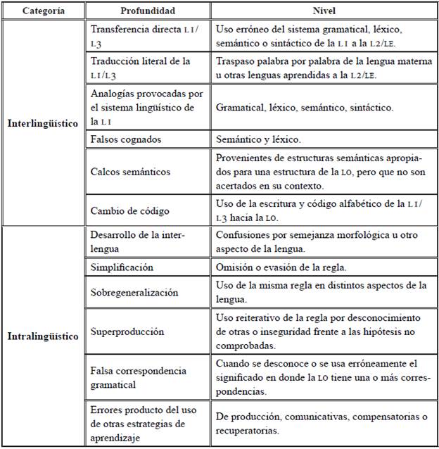 Las semejanzas o diferencias de la LI pueden contribuir a transferencias positivas o interferir negativamente induciendo a un error en el uso, omisión o falsa selección de cualquier estructura del sistema lingüístico de la LO. El fenómeno de la transferencia surge de la necesidad, por parte del aprendiente de lenguas, para solucionar alguna situación comunicativa (de la cual no es consciente en algunas ocasiones), para lo cual recurre a su lengua materna con el objeto de suplir la falencia. No obstante, existen otras estrategias que usa el aprendiz, donde el grado de conocimiento o de monitorización (conciencia de los errores) juega un papel importante cuando se comunica en la LO. Por consiguiente, los errores interlinguales son aquellos que provienen de la influencia directa o indirecta de la lengua materna u otras lenguas aprendidas por el aprendiente. En esta categoría, se clasifican los errores acordes con la naturaleza de la influencia, el tipo de estrategia utilizada por el aprendiente y el tipo de error cometido. Las clasificaciones existentes, como la propuesta por Alexopoulou (2005, 2006, 2011) o Vázquez (1991) son de tipo general y describen los errores según la taxonomía de la modificación de la lengua meta (Bustos, 1998; Santos Gargallo, 2004; Alexopoulou, 2005; Ferreira, Elejalde & Vine, 2014; Ferreira & Elejalde, 2017). A continuación, se presentan las categorías de acuerdo con el nivel de profundidad en los errores de transferencia directa de la LI hacia la LO.