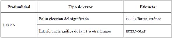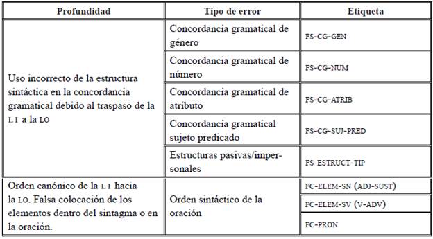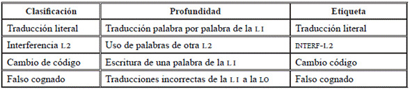 En la taxonomía que se propone (Tabla 20) se considera etiquetar los errores correspondientes a las siguientes problemáticas generadas por influencia de la LI: