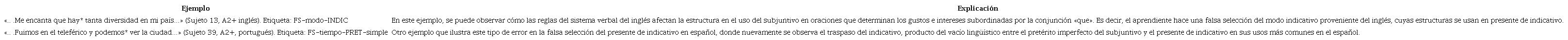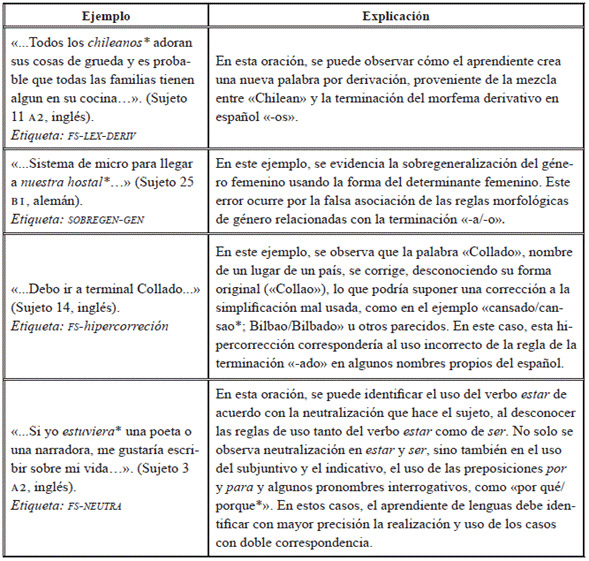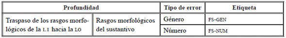 Como se muestra en la Tabla 14, con respecto a los errores de tipo morfológico, los aprendientes traspasan rasgos morfológicos de género y número. Este tipo de error se clasifica especialmente respecto de lenguas con reglas de género y número similares, como en el caso de las lenguas romances, germánicas u otras con sistemas lingüísticos parecidos. Las etiquetas para clasificar este tipo de errores corresponden a FS-GEN (falsa selección de género) y FS-NUM (falsa selección de número). Obsérvense algunos ejemplos en la Tabla 15.