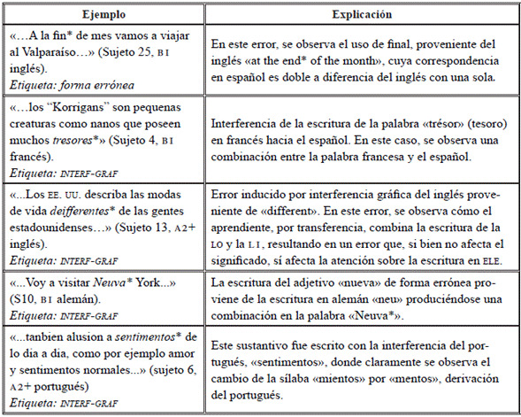 Algunos ejemplos de este tipo de errores se evidencian en el uso de palabras como por qué, porque, el porqué; u otras como rato, momento, ahora, después, en relación con el tiempo. Por otra parte, con los errores de tipo gráfico como la interferencia gráfica dentro de la categoría léxico, corresponde a aquellas palabras escritas en la lo, pero que, en medio o al final, usan alguna tipificación de la LI (Tabla 17).