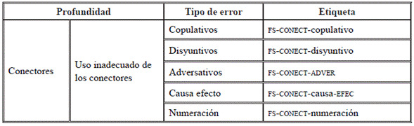 Con respecto a la profundidad y el nivel de análisis de los errores y su localización dentro del sistema lingüístico, es necesario establecer las categorías sobre las que operan las etiquetas (Tabla 3). En ese aspecto, las propuestas de estudios previos (Ferreira, Elejalde & Vine, 2014; Rakaseder & Schmidhofer, 2014) buscan desglosar en qué categoría del sistema lingüístico se ha cometido el error. Obsérvese en la Tabla 4 los tipos de categoría y profundidad de análisis.